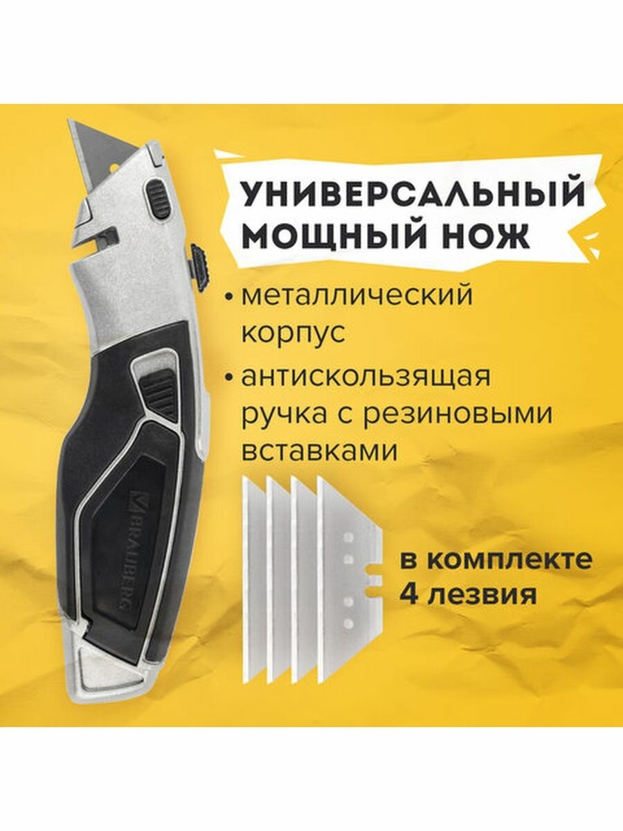 СохранитьНож универсальный мощный BRAUBERG «Professional», 4 лезвия в комплекте, автофиксатор, металл, 237160 интересное: