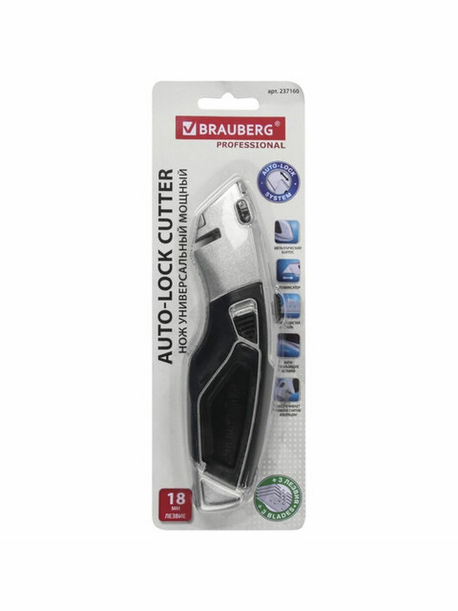 Нож универсальный мощный BRAUBERG "Professional", 4 лезвия в комплекте, автофиксатор, металл, 237160 (цена за 1 ед.товара)
