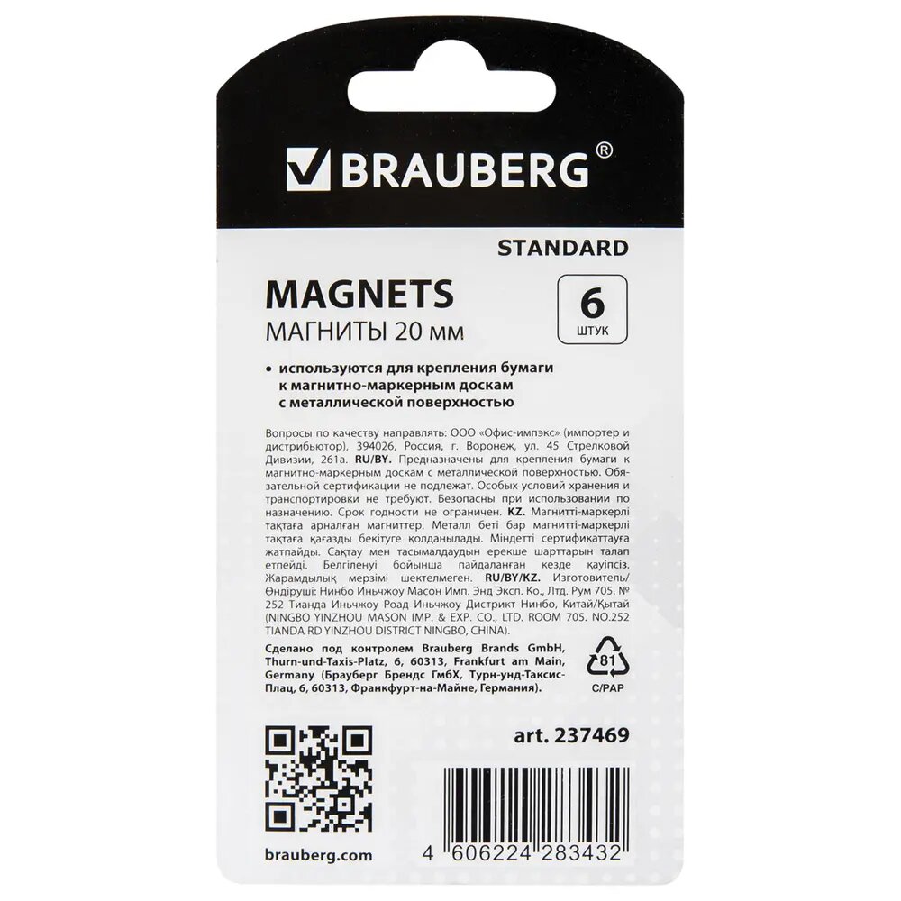 Магниты малого диаметра 20 мм, набор 6 шт., ассорти, BRAUBERG "STANDARD", 237469 Комплект : 1 шт .