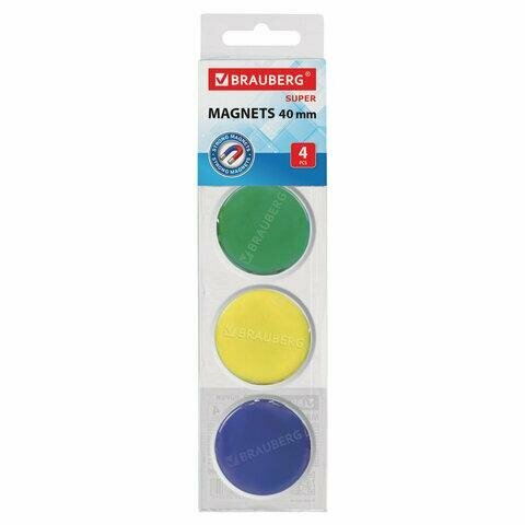 Купить Магниты мощные 40 мм (большого диаметра), набор 4 шт., ассорти, BRAUBERG "SUPER", 237480 Комплект - 6 шт.