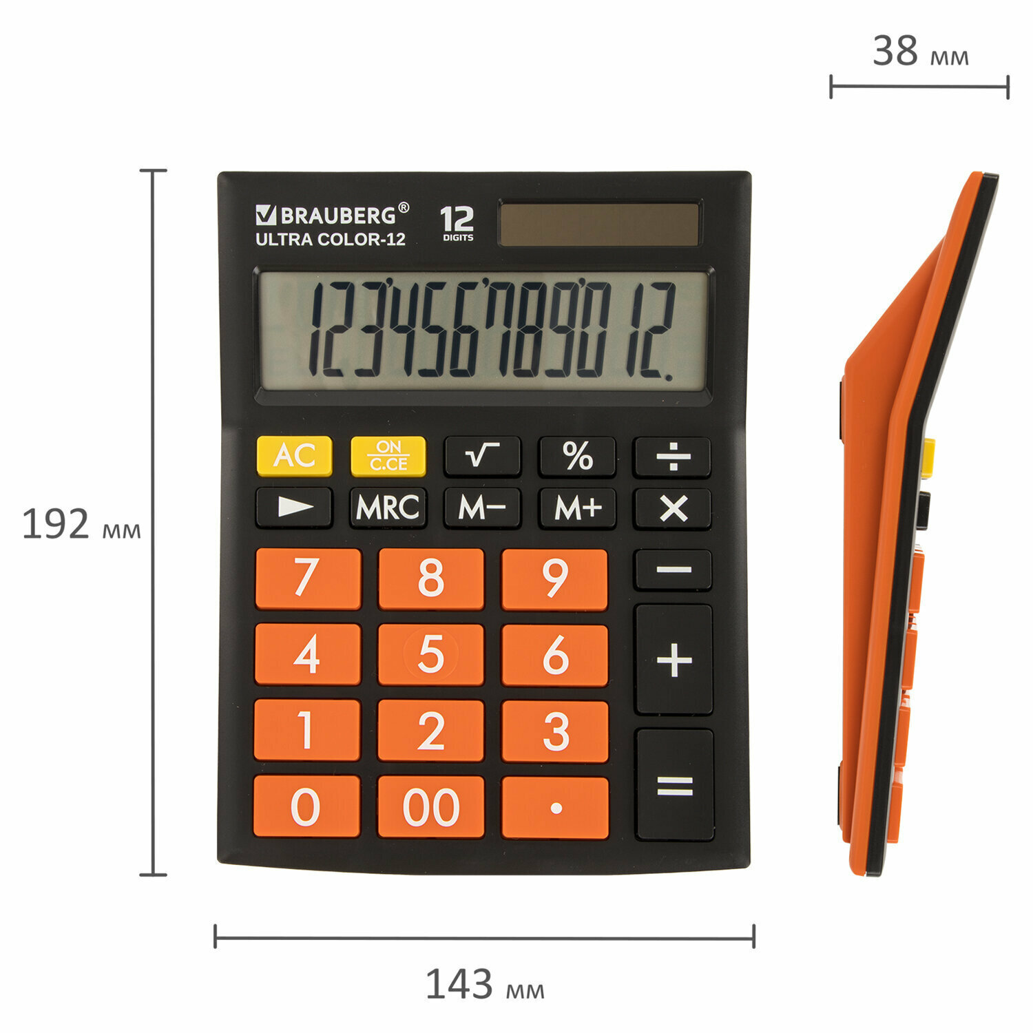 Калькулятор настольный BRAUBERG ULTRA COLOR-12-BKRG (192x143 мм), 12 разрядов, двойное питание, черно-оранжевый, 250499, 250499