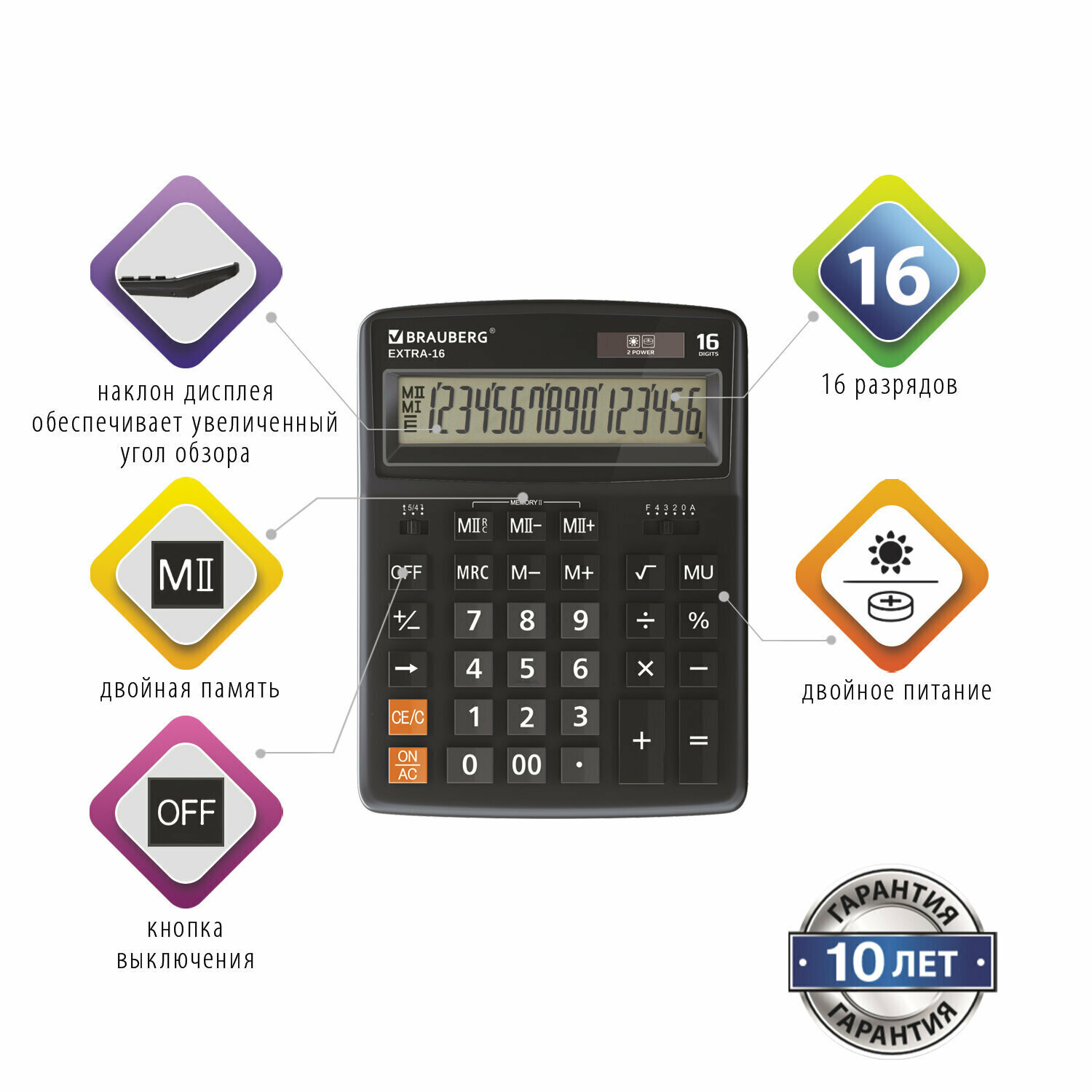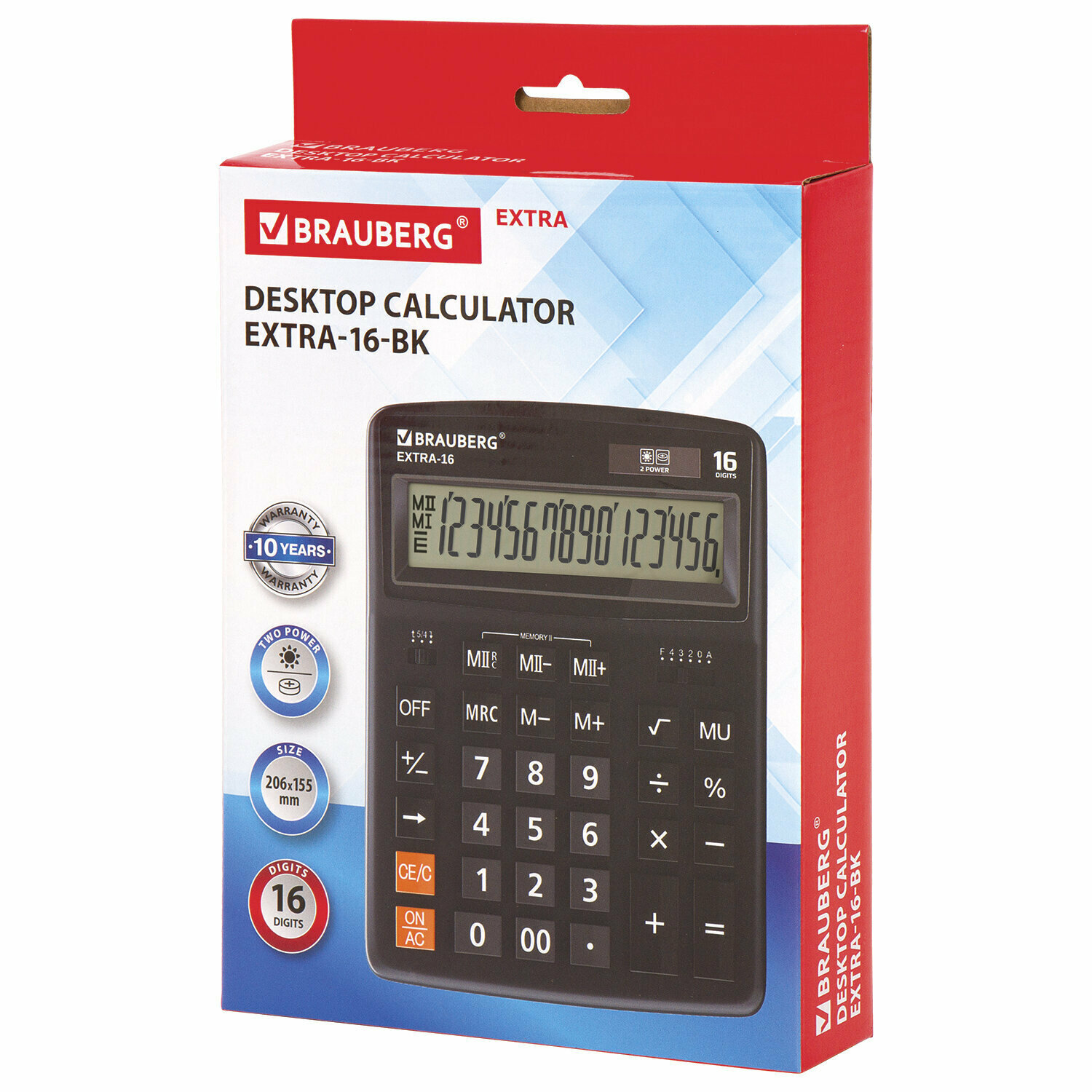Калькулятор настольный BRAUBERG EXTRA-16-BK (206x155 мм) 16 разрядов двойное питание черный, 1 шт