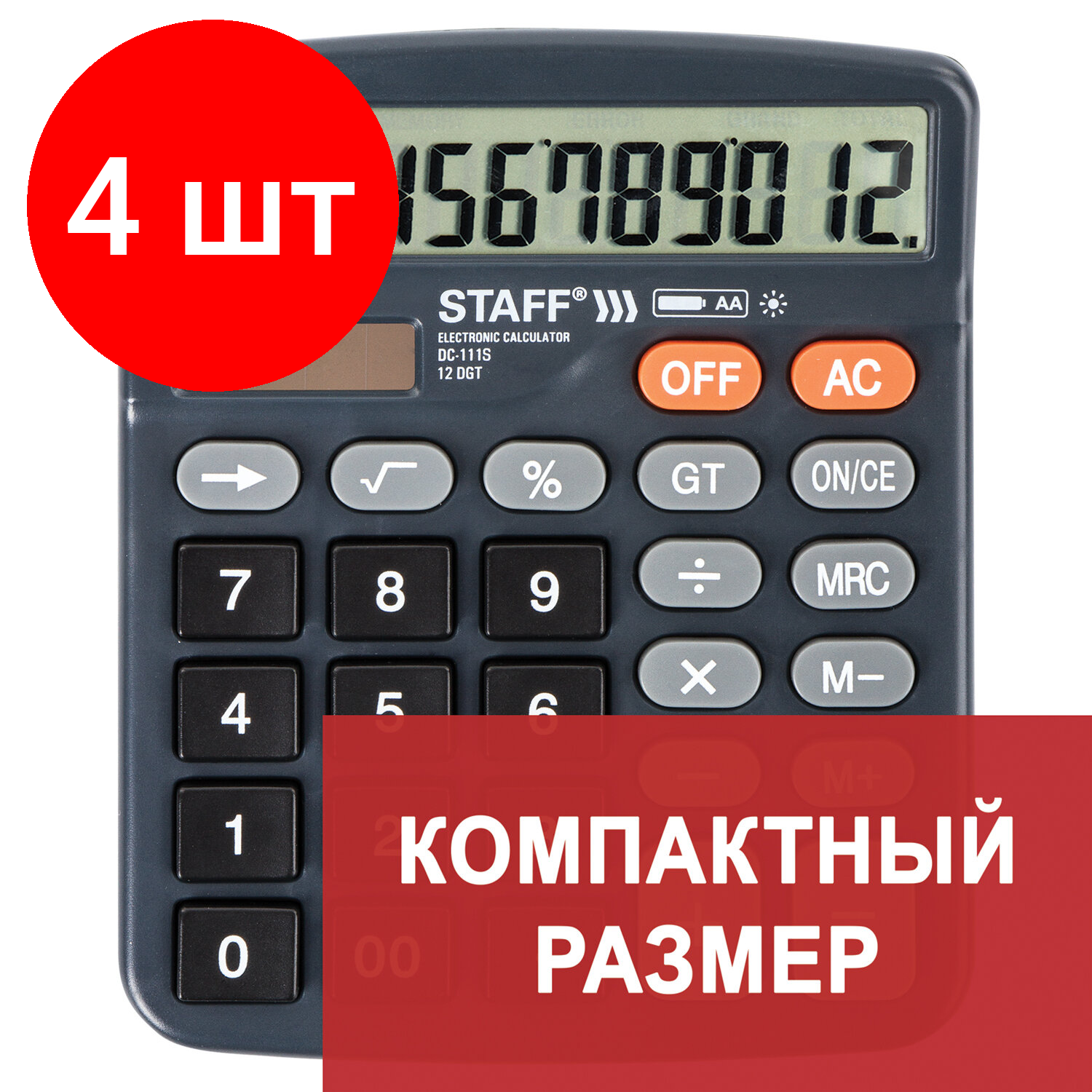 Купить Комплект 4 шт, Калькулятор настольный STAFF PLUS DC-111S, компактный (150x120 мм), 12 разрядов, двойное питание, + батарейка АА, 250428