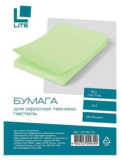 Бумага Lite А4 70 г/м2 50 л. пастель зелёный интересное:
