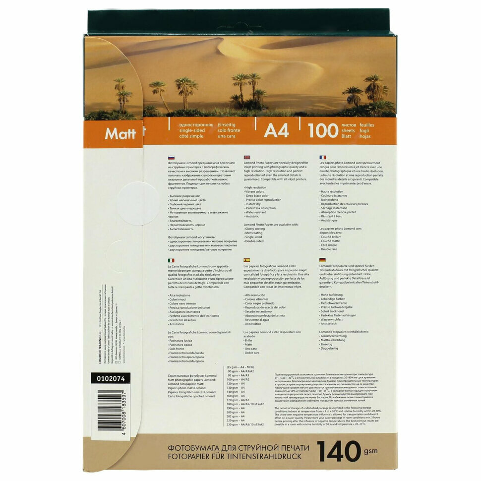 Фотобумага Lomond матовая, А4, 140 г/м2, односторонняя, 100 листов (102074)