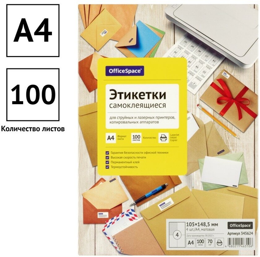 Этикетки самоклеящиеся А4 100л. OfficeSpace, белые, 04 фр. (105*148.5), 70г/м2