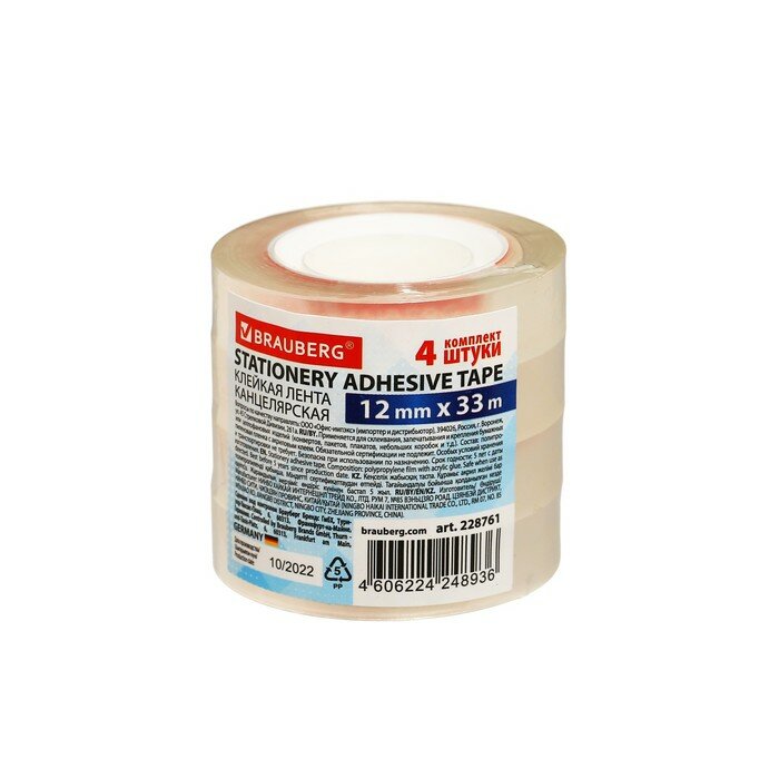 Купить Клейкие ленты 12мм х 33м канцелярские BRAUBERG, комплект 4шт., прозрачные, гарантиров. длина, 228761
