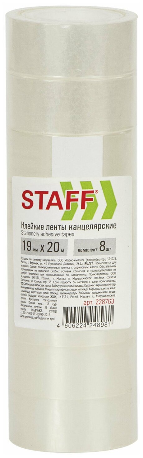 Клейкая лента канцелярская Staff 19 мм х 20 м канцелярские , комплект 8 шт., прозрачные, гарантированная длина, 228763