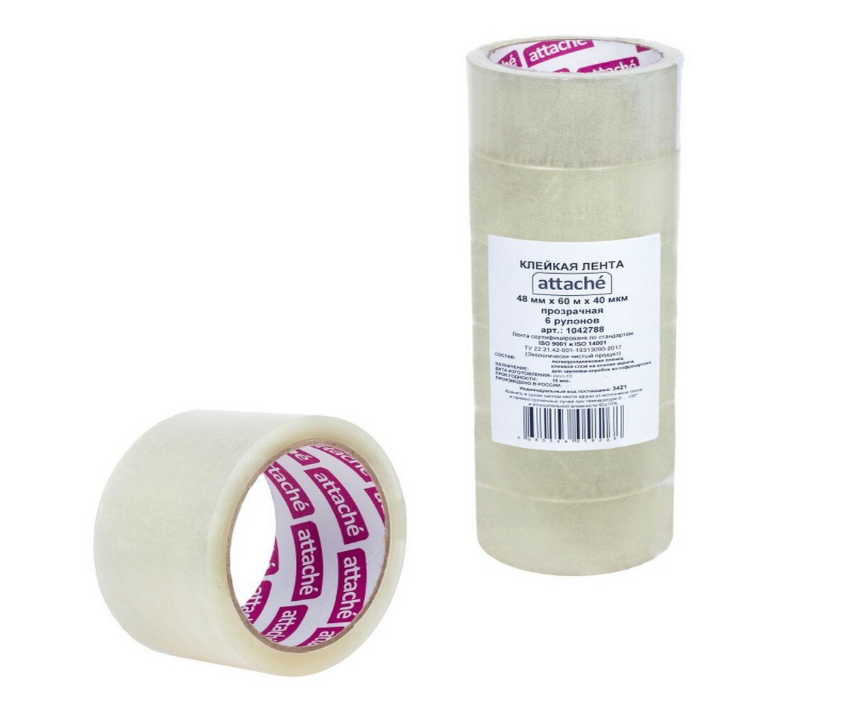 Купить Клейкая лента канцелярская Клейкая лента упаковочная ATTACHE 48мм х 60м 40 микрометров прозрачная 6 шт. в упаковке