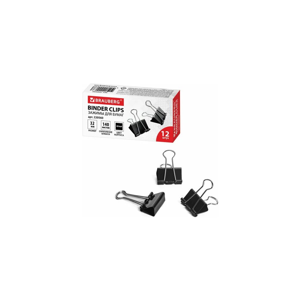 Зажимы для бумаг BRAUBERG, комплект 12 шт., 32 мм, на 140 листов, черные, картонная коробка, 220560 (цена за 1 ед.товара)
