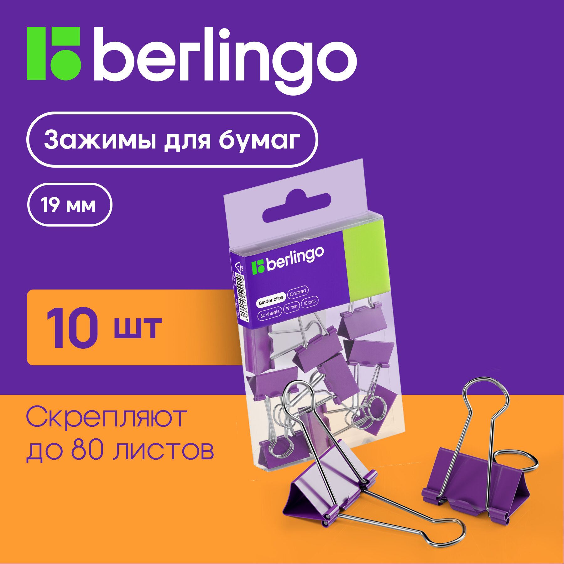 Зажимы для бумаг металлические Berlingo (19мм, до 80 листов, фиолетовые) ПВХ упак., 10шт. (BC1019a)