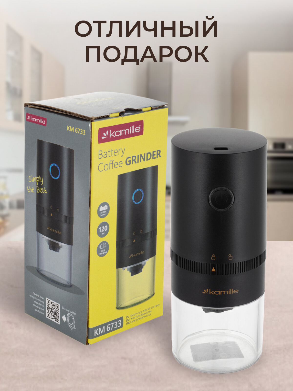 Кофемолка электрическая с аккумулятором KAMILLE.