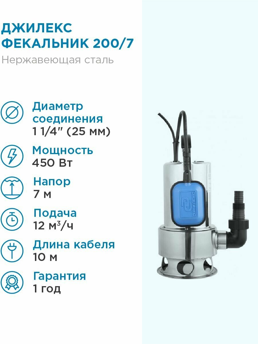 Насос фекальный 200/7Н (450Вт, 200л/мин, напор 10м, ?частиц 35мм, кабель 10м, глуб. 8м, корпус - нерж. сталь) ДЖИЛЕКС 5305