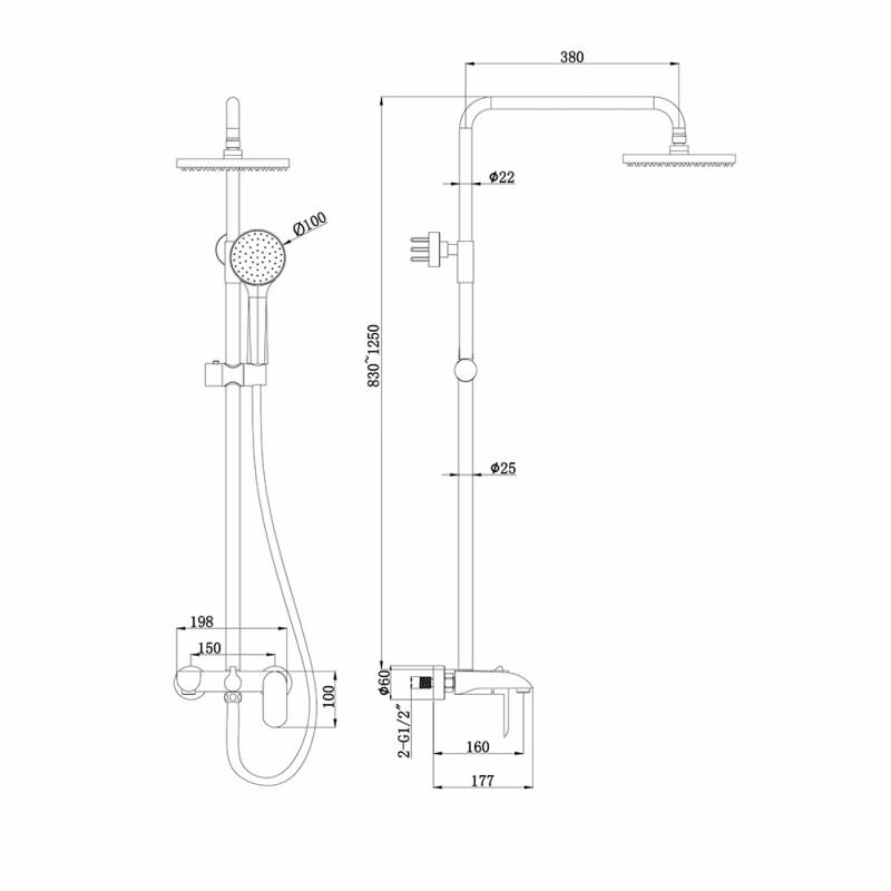 | Дополнительная информация | высота стойки для душа: 1250 мм; диаметр душевой лейки: 100 мм; диаметр верхнего душа: 200 мм |