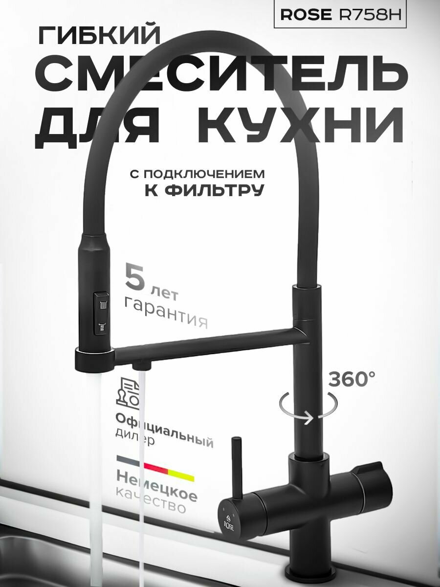 Смеситель для кухни с гибким изливом и фильтром питьевой воды Rose R758H, черный