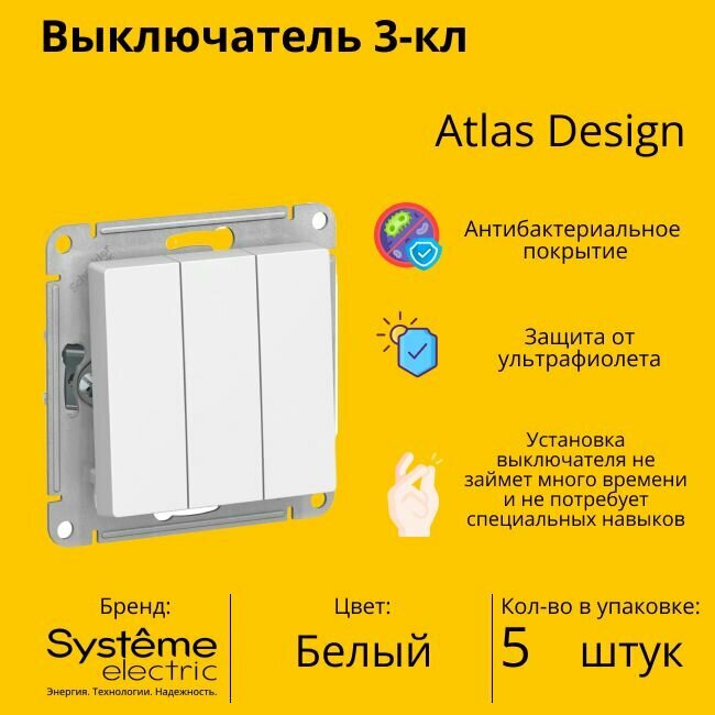 3 шт. Systeme Electric AtlasDesign Жемчуг Выключатель 3-клавишный сх.1+1+1, 10АХ, механизм, ATN000431