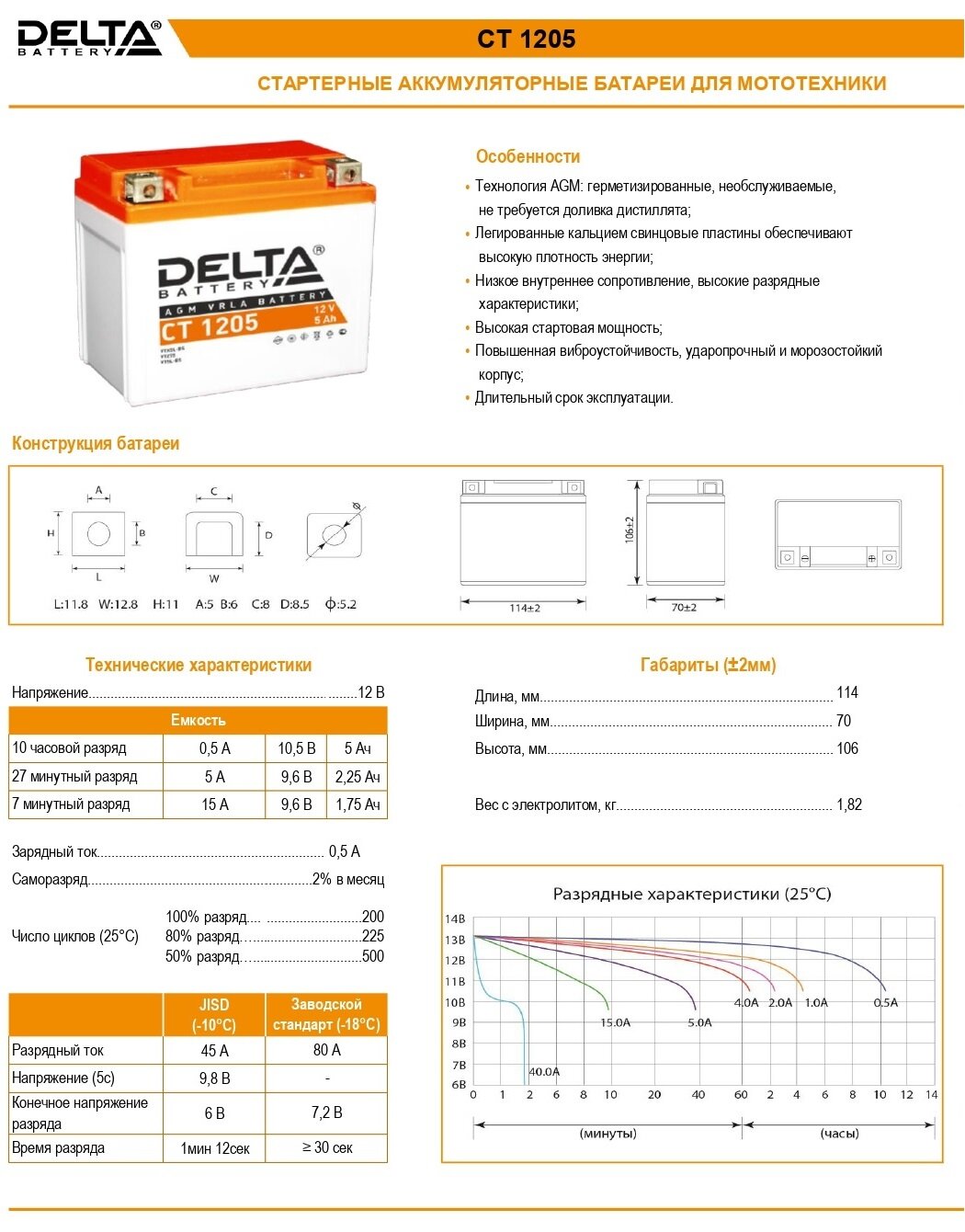 Мото Delta 12В 5Ач (Ytx5l-Bs, Ytz7s) О/П Д*Ш*В 11,4X7,0X10,6 См Арт. Ct 1205 Delta арт. CT1205