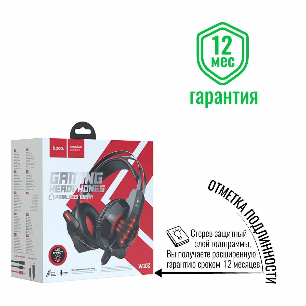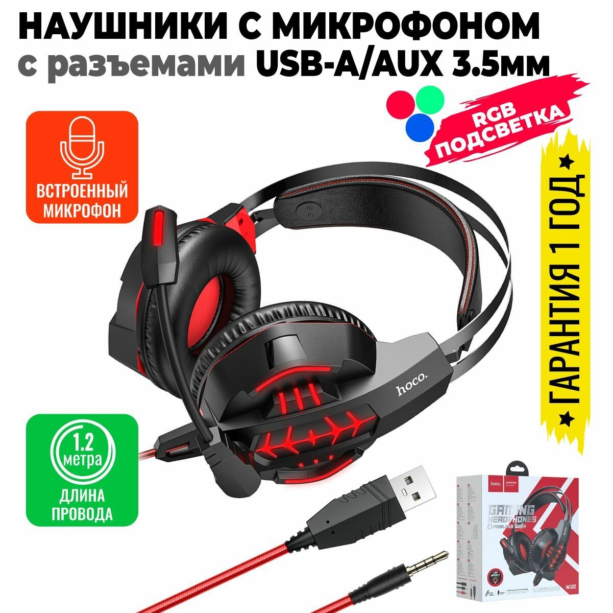 Наушники игровые проводные aux 3.5/USB полноразмерные накладные с микрофоном, подсветкой Hoco W102 для телефона Айфон, Андроид, компьютера, ноутбука