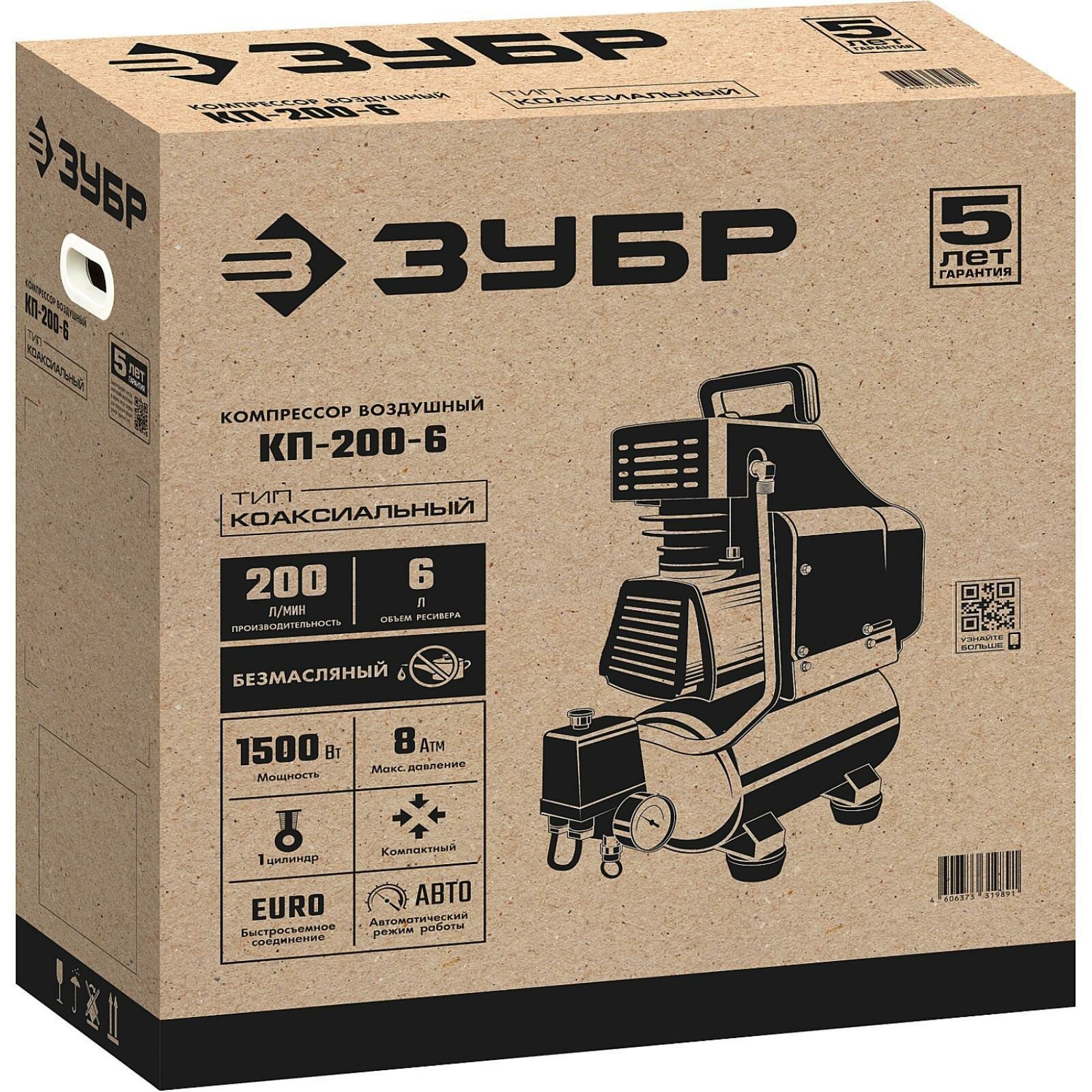 Компрессор безмасляный ЗУБР КП-200-6, 6 л, 1.5 кВт