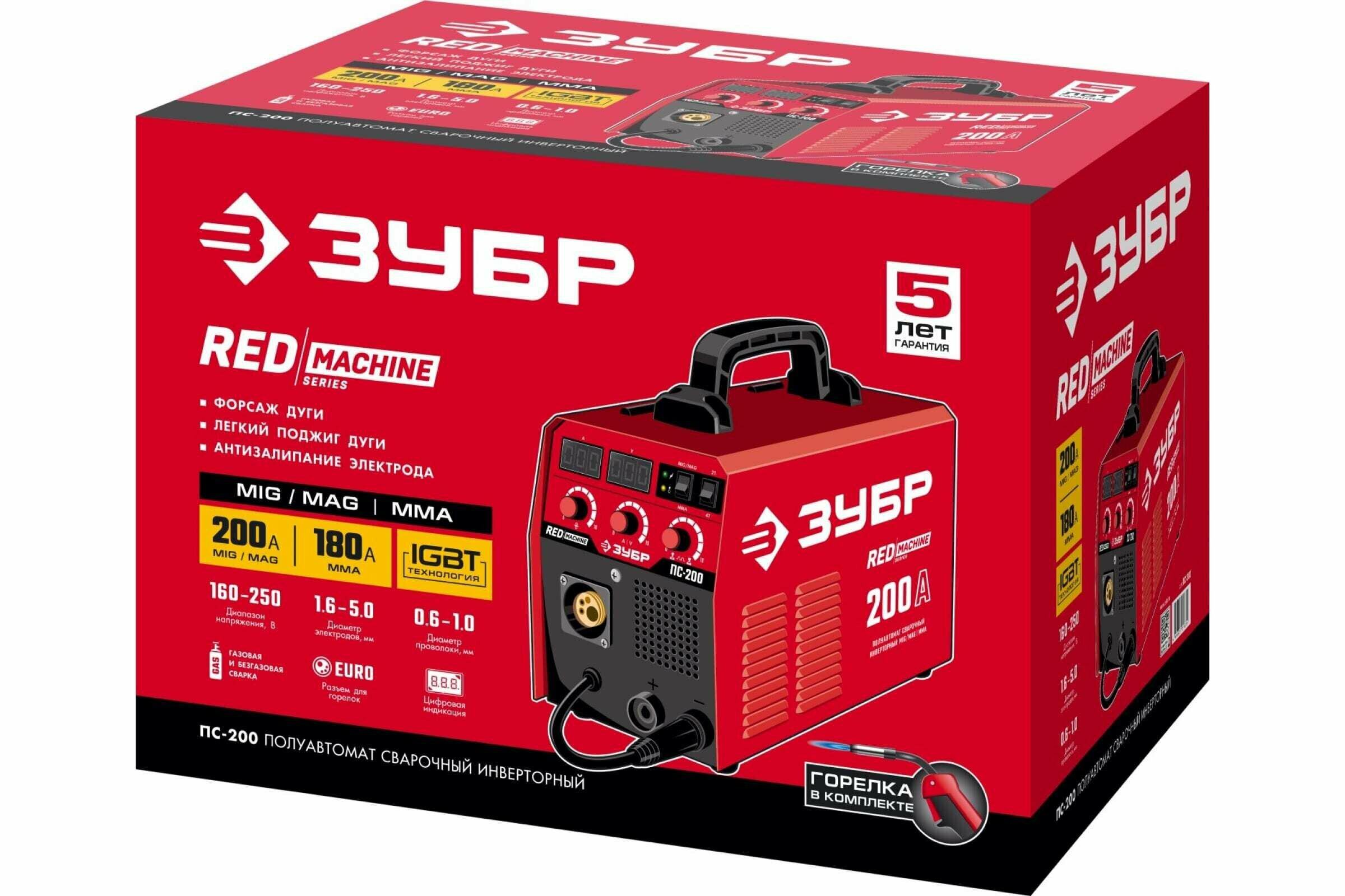 ЗУБР MIG-MAG / ММА, 200 А, RED MACHINE, сварочный полуавтомат инверторный (ПС-200)