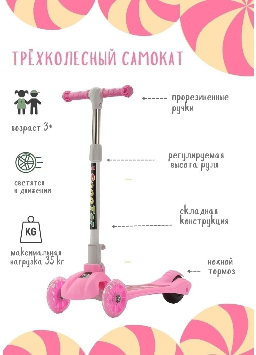 Самокат детский трехколесный, розовый