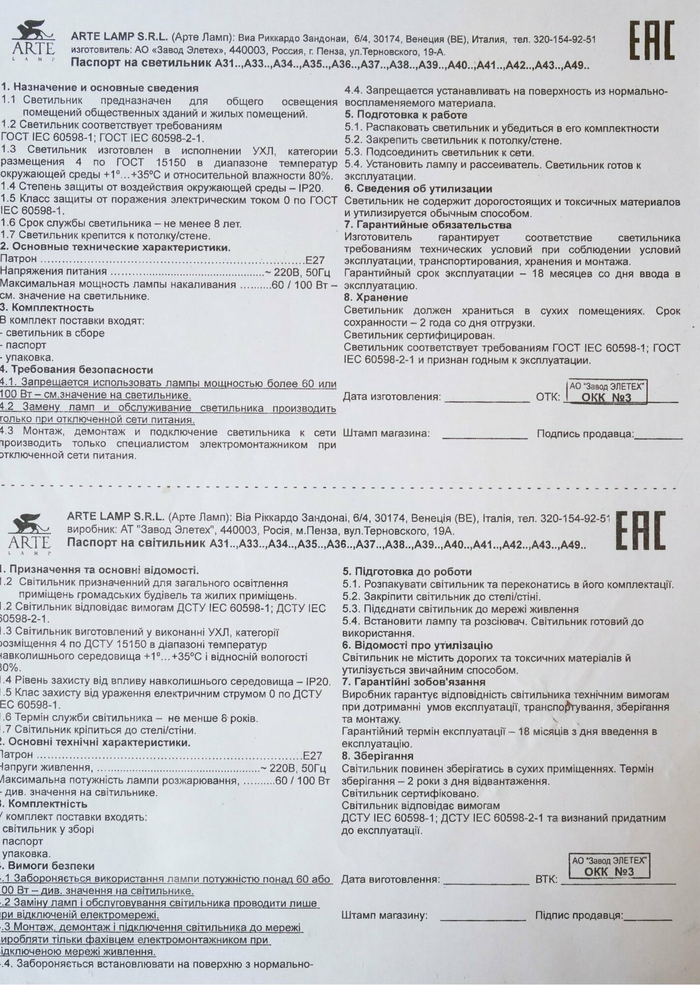 | Мощность одной лампы | 60 Вт |