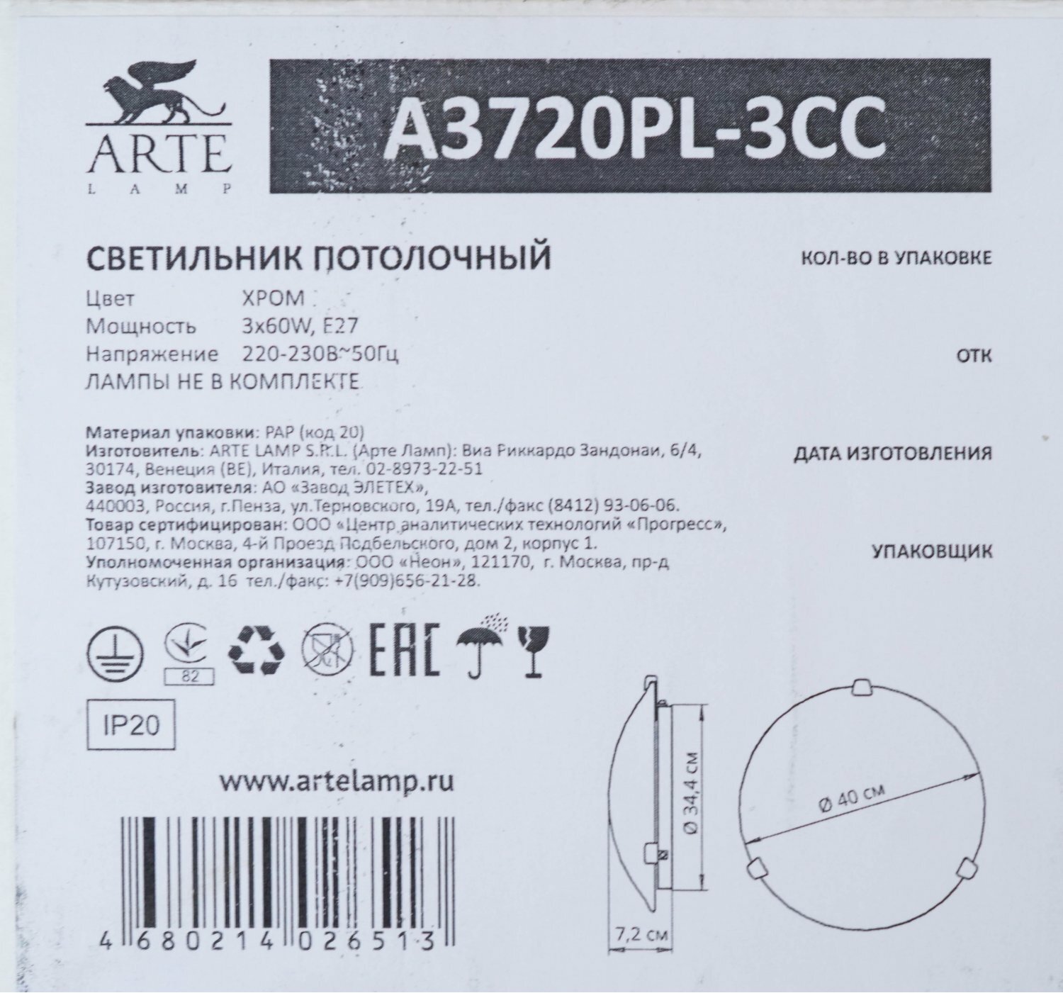 Купить ARTE Lamp #ARTE LAMP A3720PL-3CC светильник потолочный