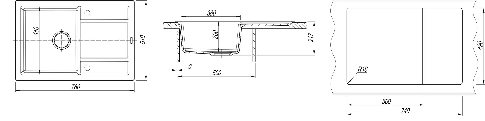 Мойка для кухни врезная каменная Florentina ЛИПСИ-760, цвет серый шелк, с крылом, прямоугольная, 760х510х217 мм