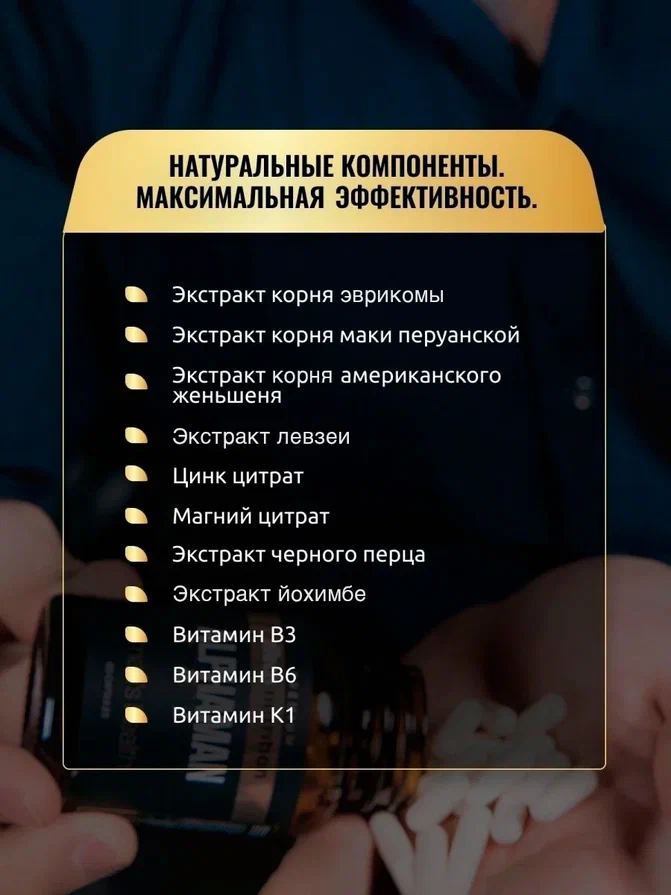 | Состав | экстракт корня тонгкат али, экстракт корня маки перуанской, экстракт плодов американского женьшеня, экдистерон, цинк цитрат, магний цитрат, экстракт ашвагандахи, экстракт черного перца (пиперин), йохимбин, витамин В3 (ниацин), витамин В6, витамин К1 (филло хинон), диоксид кремния, капсула (желатин). |