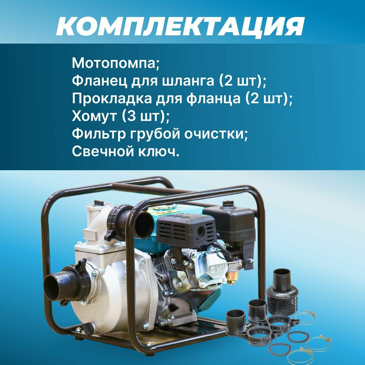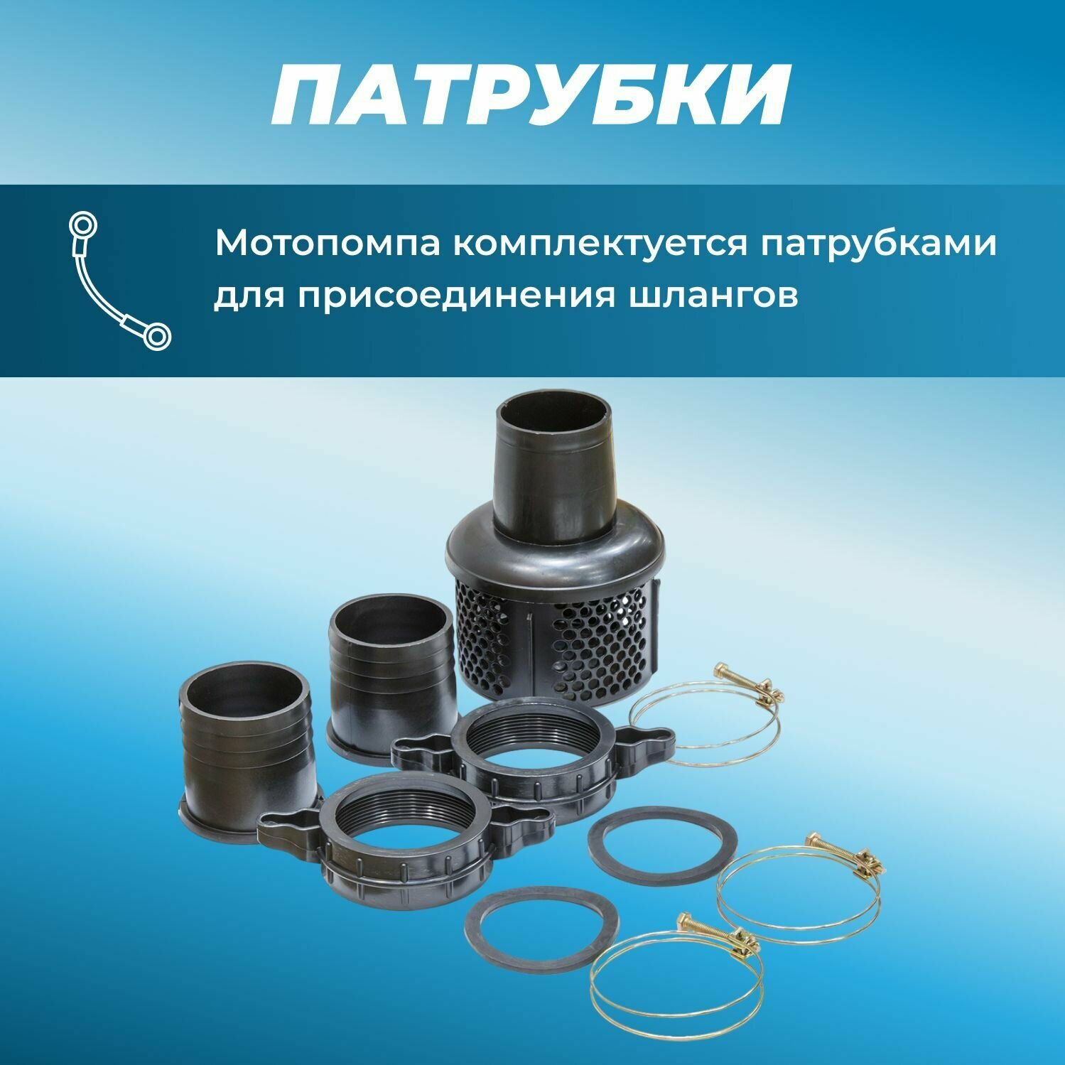 | Комплектация | прокладка (2 шт.), фланец всасывающего шланга, фланец напорного шланга, гайка фланца (2 шт.), хомут (3 шт.), фильтр грубой очистки, руководство по эксплуатации |