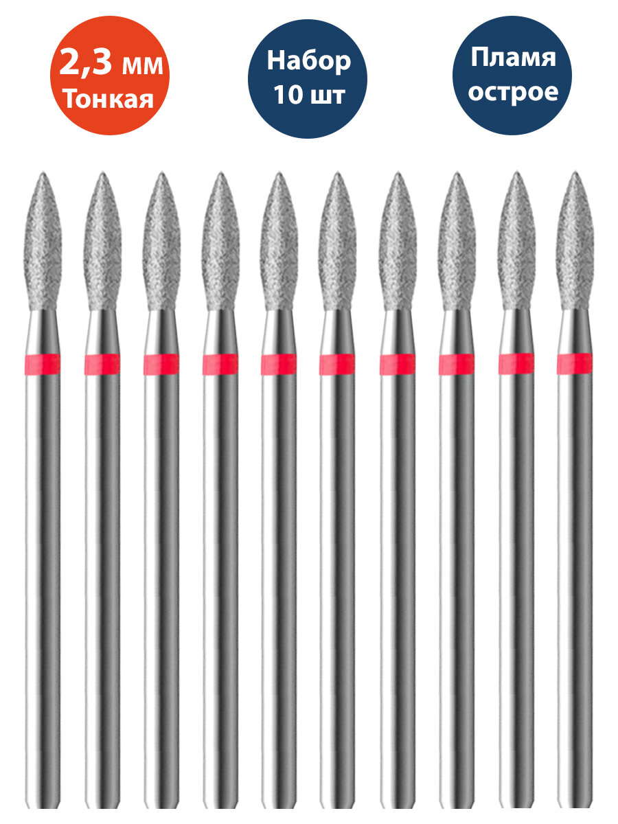 Владмива Фреза алмазная для маникюра и педикюра, кутикулы, d-2.5, Тонкая (красная насечка), Пламя, (упаковка 10 шт), 806 104 243 514 025