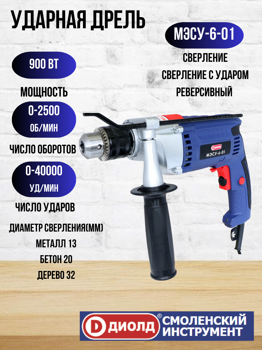 Дрель сетевая ударная диолд МЭСУ-6-01 / сдвоенный подшипник, патрон 1,5-13 мм, реверс, 900 Вт, 2500 об/мин