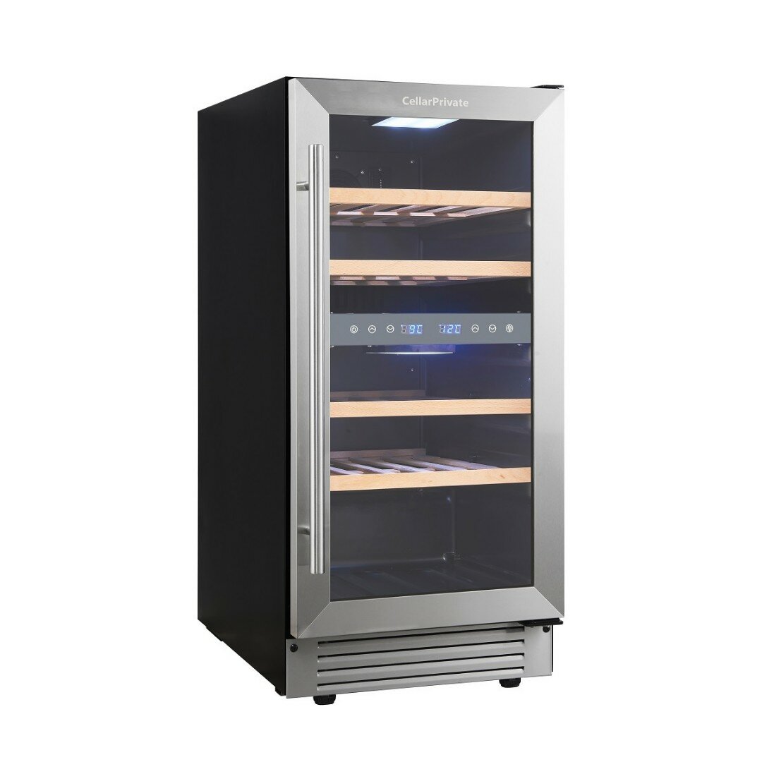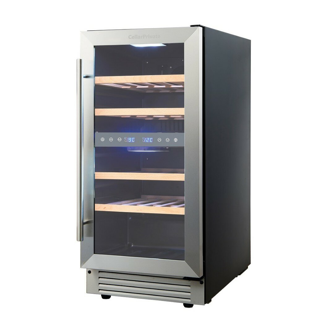 Винный шкаф Cellar Private CP027-2T, встраиваемый, двухтемпературный 27бут, серебристый.