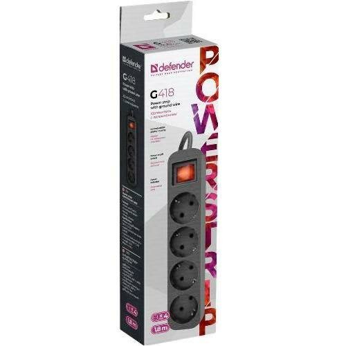 Удлинитель сетевой Defender G418, 4 розетки с заземлением , 1.8 метра , выключатель , черный