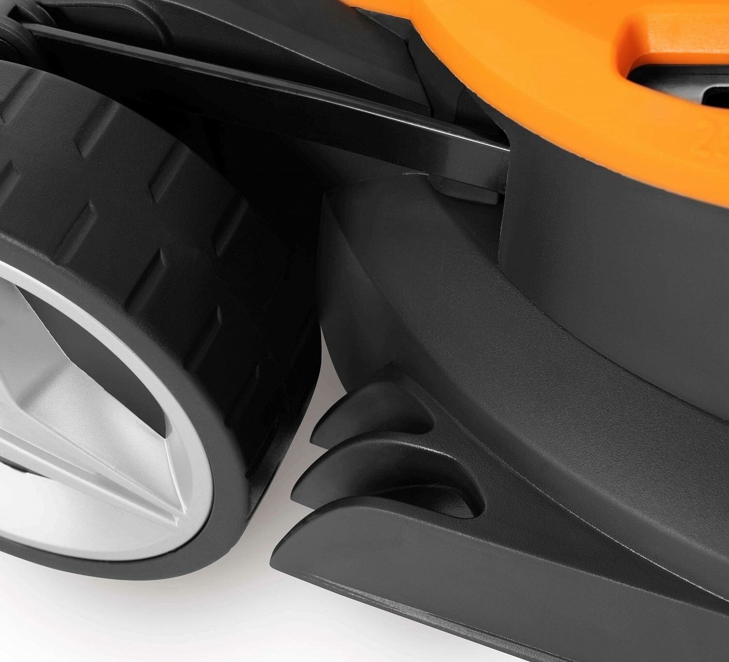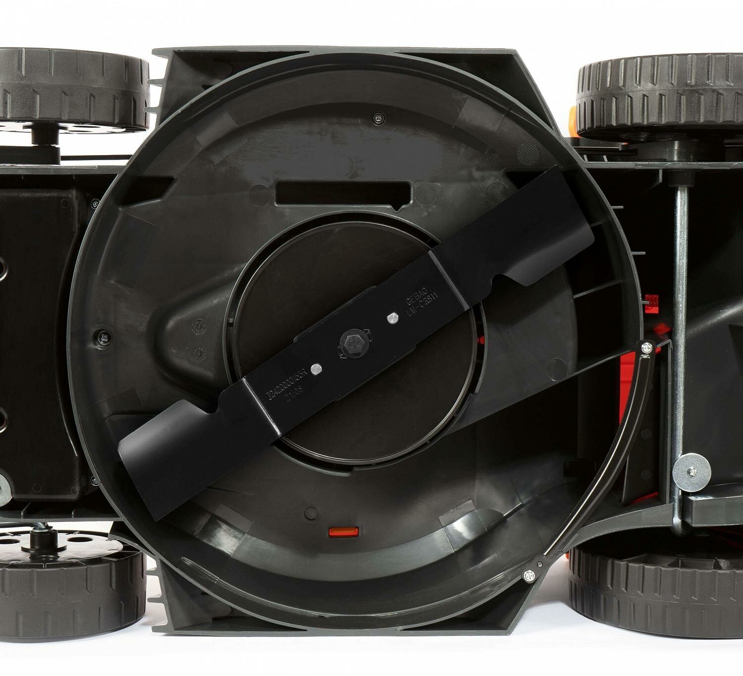 Один рычаг на регулировку высоты. После прохода не остается нескошенной травы и хорошо засасывает все срезанное. |