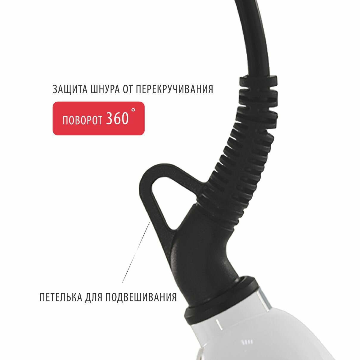 | Особенности | вращение шнура / дисплей / индикация включения / индикация готовности к работе / петля для подвешивания |