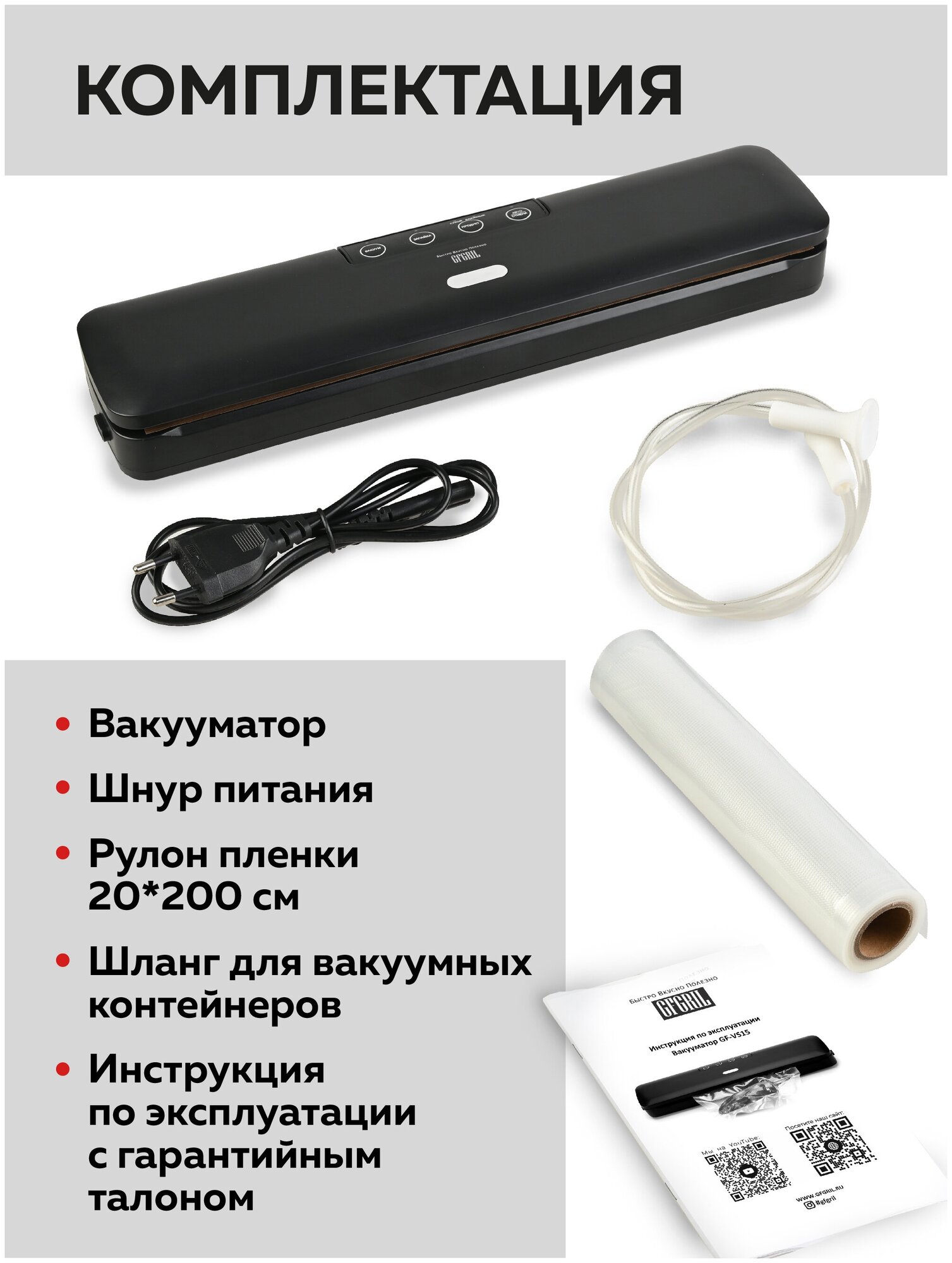 | Подробная комплектация | Вакууматор, инструкция |