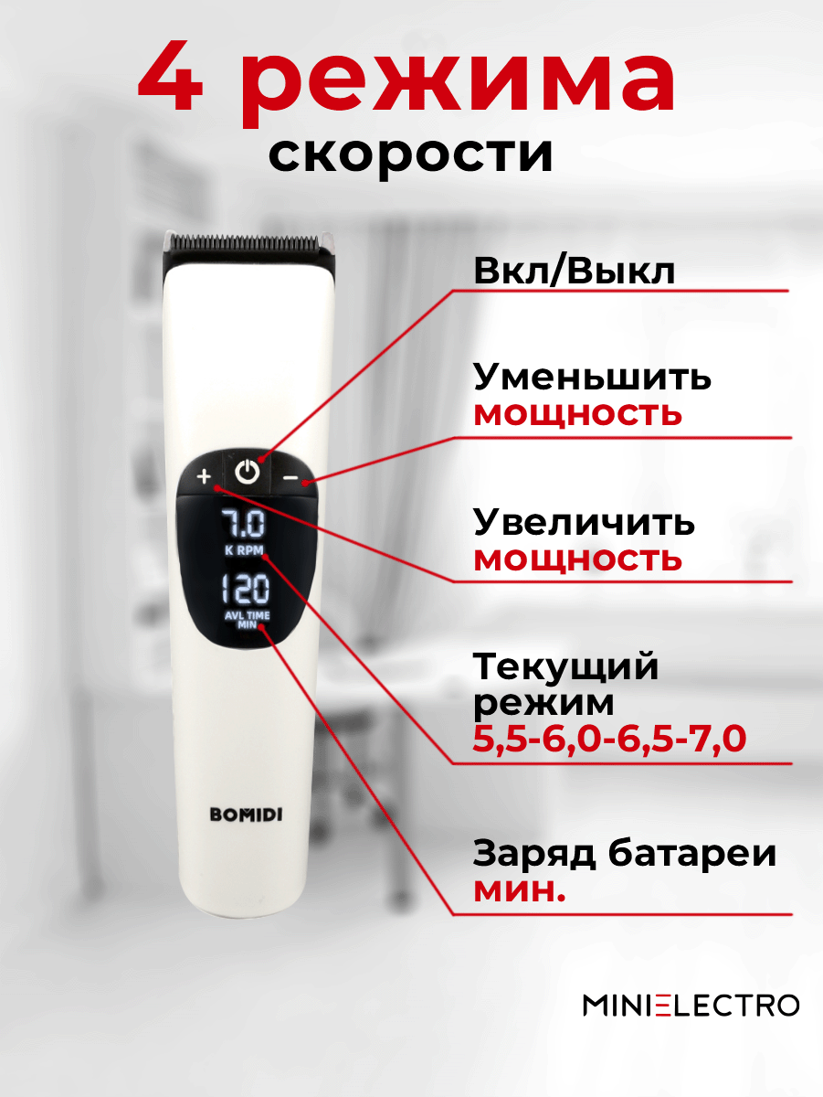 Регулятор скорости, всего скоростей 4. Информативный дисплей (который в принципе не нужен). Много насадок. В комплекте масло но мало. Нельзя мыть водой, только щеткой. |