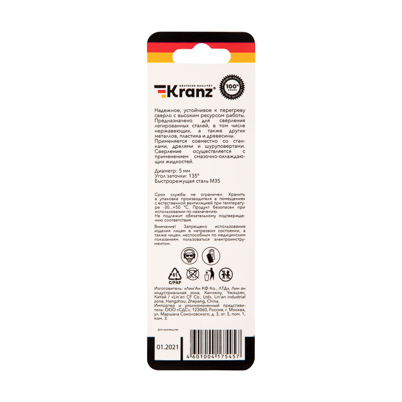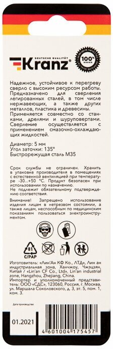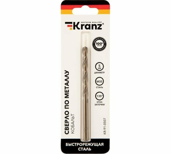 Сверло по металлу KRANZ 5 мм, с добавлением кобальта повышенной прочности, стандарт качества DIN 338 интересное: