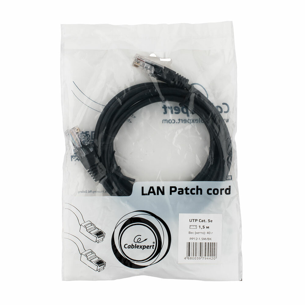 Патч-корд UTP CAT5e Cablexpert PP12-1.5M/BK RJ-45 кабель 1.5 метра - черный