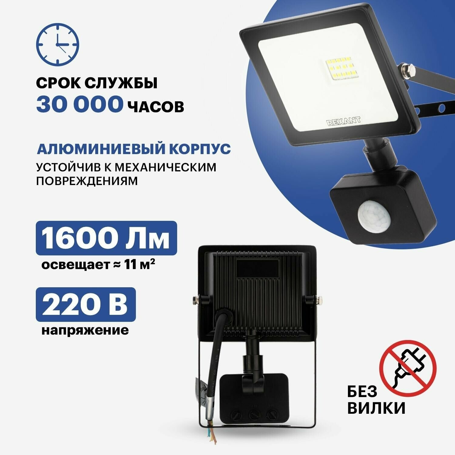 Светодиодный прожектор Rexant с датчиком движения 20 Вт, 200-260В, IP44, 1600 Лм, 6500 K, холодный свет