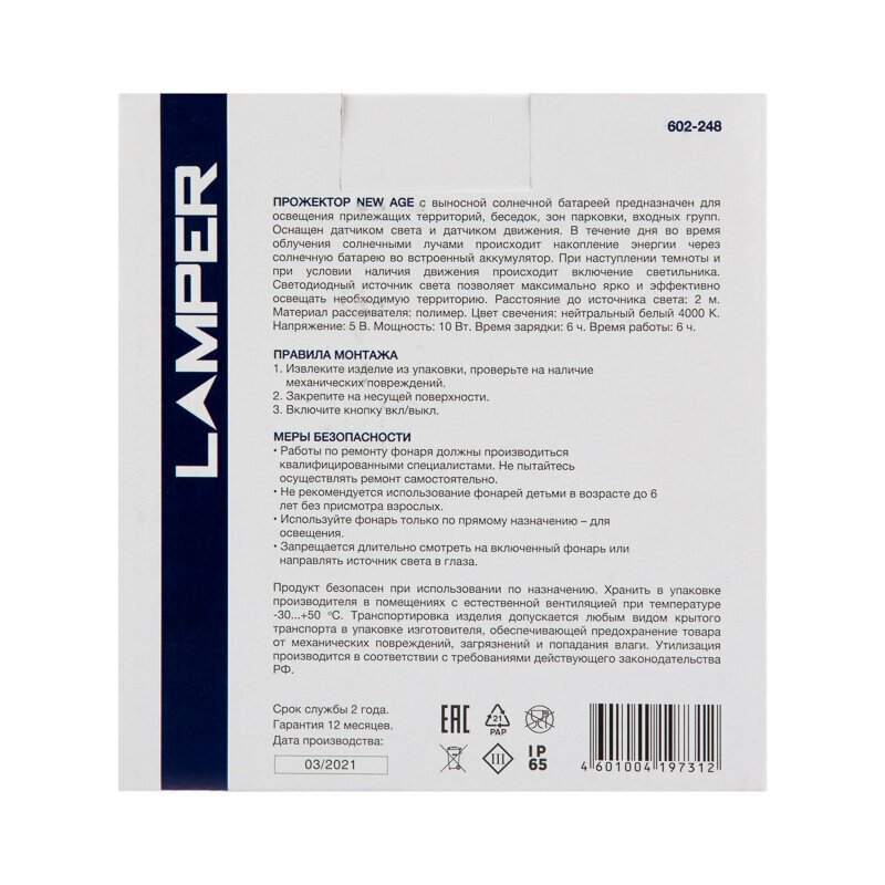 Ниже Вы можете прочитать отзывы на Прожектор Lamper 602-248 LED 98х150х30 мм с выносной солнечной панелью 2 м и аккумулятором, ознакомится с подробными характеристиками, посмотреть интересные обзоры и фотографии на Прожектор Lamper 602-248 LED 98х150х30 мм с выносной солнечной панелью 2 м и аккумулятором.