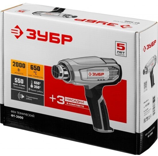 Фен технический (строительный), ЗУБР ФТ-2000, насадки 3 шт, 2 режима: 350град/ 350л/мин, 650град/ 550л/мин, коробка, 2000Вт