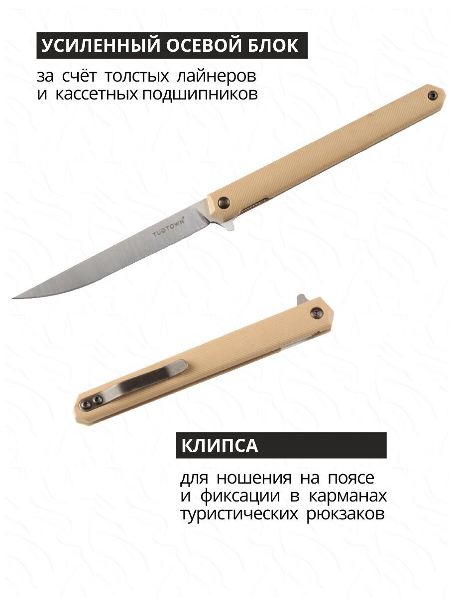 СохранитьTuoTown BDJ-S — Складной EDC нож, на каждый день (флиппер на подшипнике), клин. из D2, рук. пластик Tan интересное: