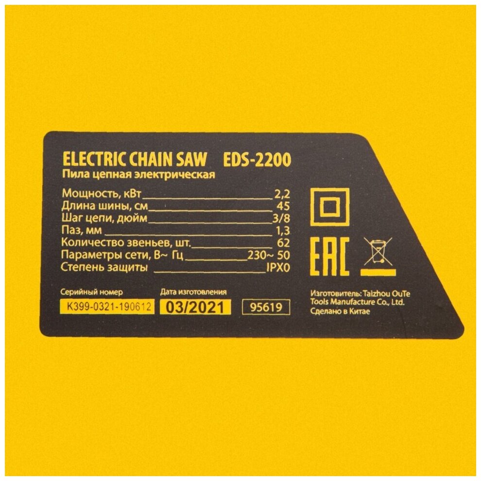 Пила цепная электрическая EDS-2200, 2,2кВт,продольная,шина 45см,шаг 3/8, паз 1,3мм, 62зв// Denzel арт. 95619