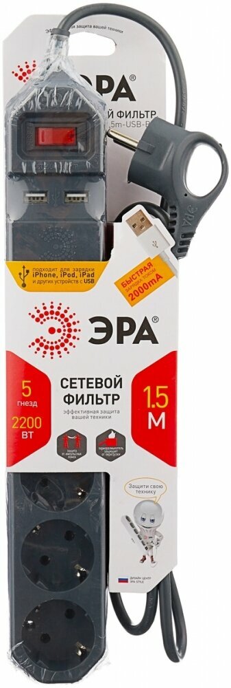 Сетевой фильтр ЭРА 1.5м 6 розеток, черный (USF-6es-1.5m-B-BOX)
