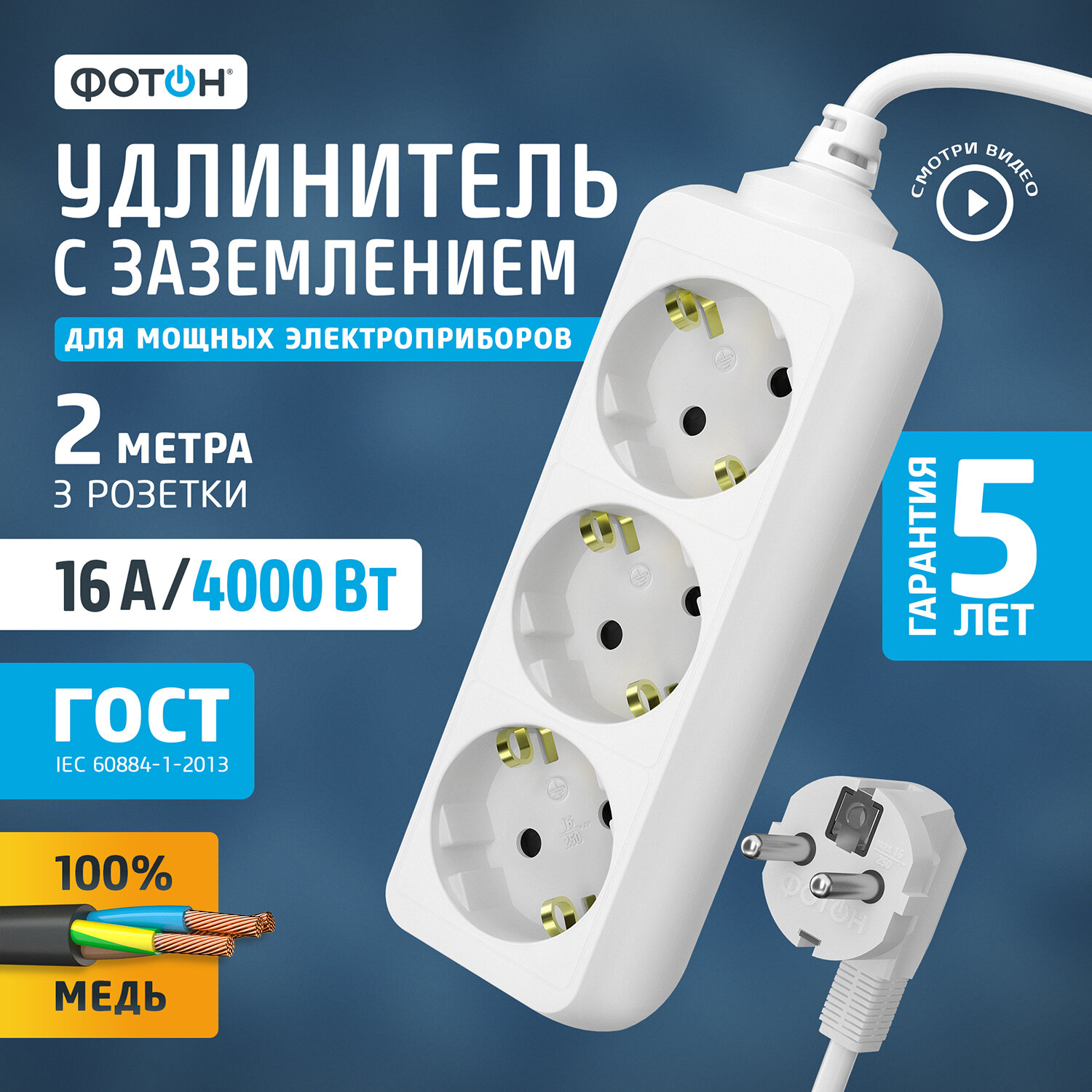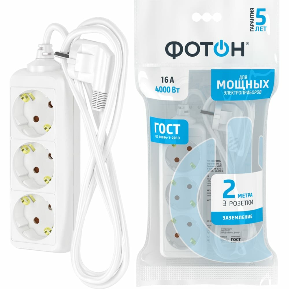 Удлинитель сетевой для розетки фотон 16А 2м 3 розетки с заземлением белый, ГОСТ интересное: