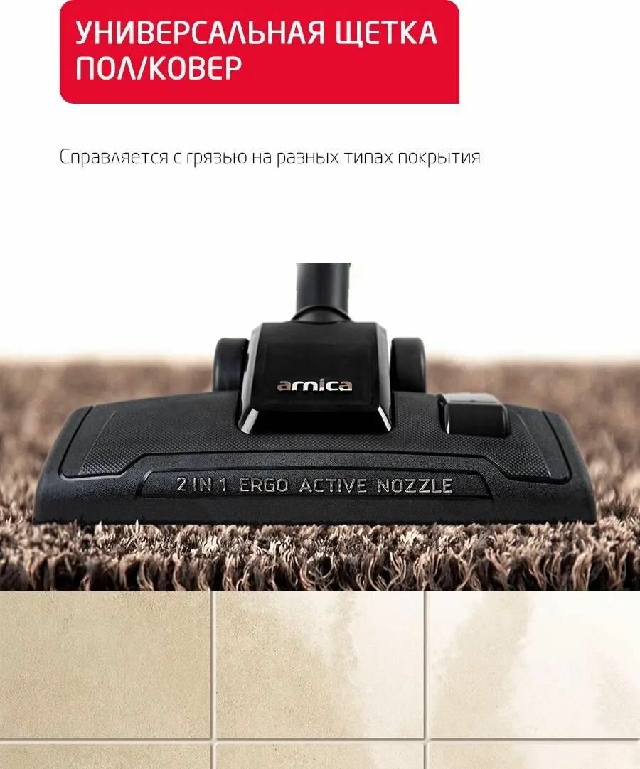 | Насадки в комплекте | Универсальная насадка пол/ковер с высокой мощностью всасывания 2 in 1 Ergo Active Nozzle, Турбо-щётка, Удлиненная щелевая насадка, Насадка для чистки текстиля, тканевых обивок мебели (прямоугольная), Насадка с мягким ворсом для мебели, Крепление для аксессуаров |