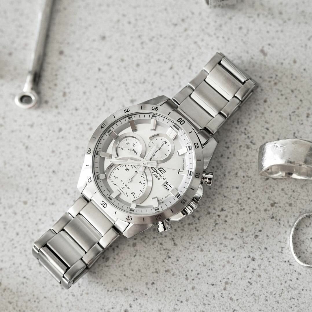 EFR-571D-1A Casio наручные часы кварцевые WR100 (10 атм) мужские серебряный, черный отображение числа подсветка стрелок минеральное стекло
