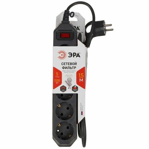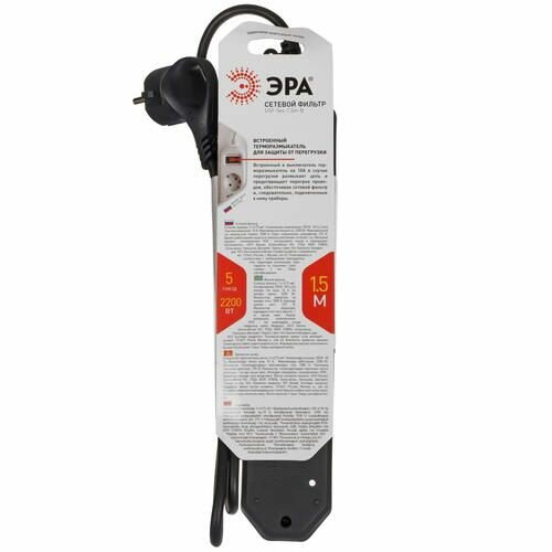 Сетевой фильтр ЭРА USF-5es-1.5m-B с базовой защитой с заземл. с выкл. 5 розеток 1,5м 10А черный